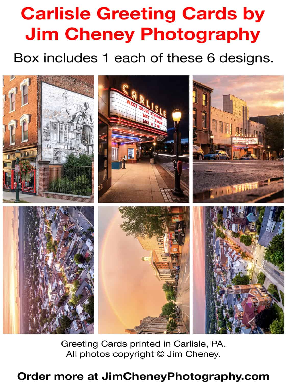 Show your love of Carlisle, PA with this greeting card set that is sure to delight. Each box comes with six cards of six different images printed onto glossy cards and folds to a 5×7 size. Cards are blank on the inside and come in a kraft box with six envelopes.