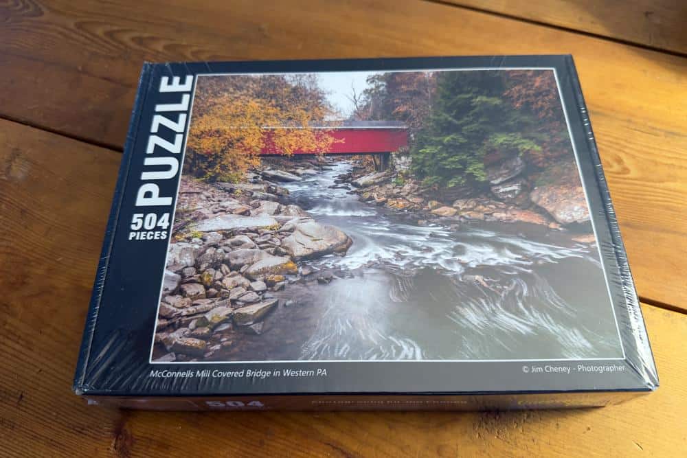 Love puzzles? This 504-piece puzzle is sure to be a ton of fun to put together and is also a great gift! This puzzle is a photo of McConnells Mill Covered Bridge in Western PA by Jim Cheney, creator of UncoveringPA.com.